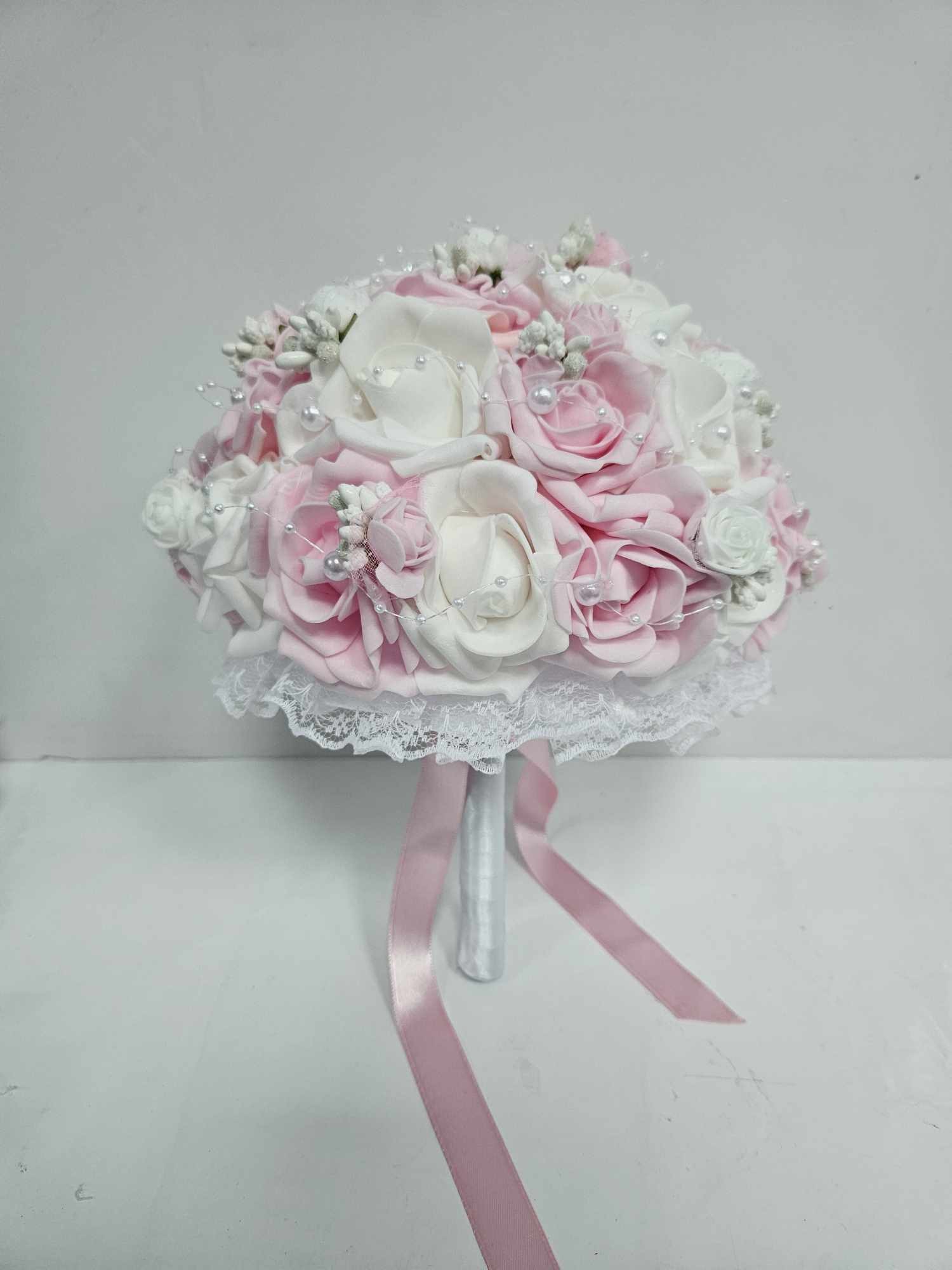 Булчински букет от изкуствени цветя, декориран с големи рози, тичинки, перли и сатен.