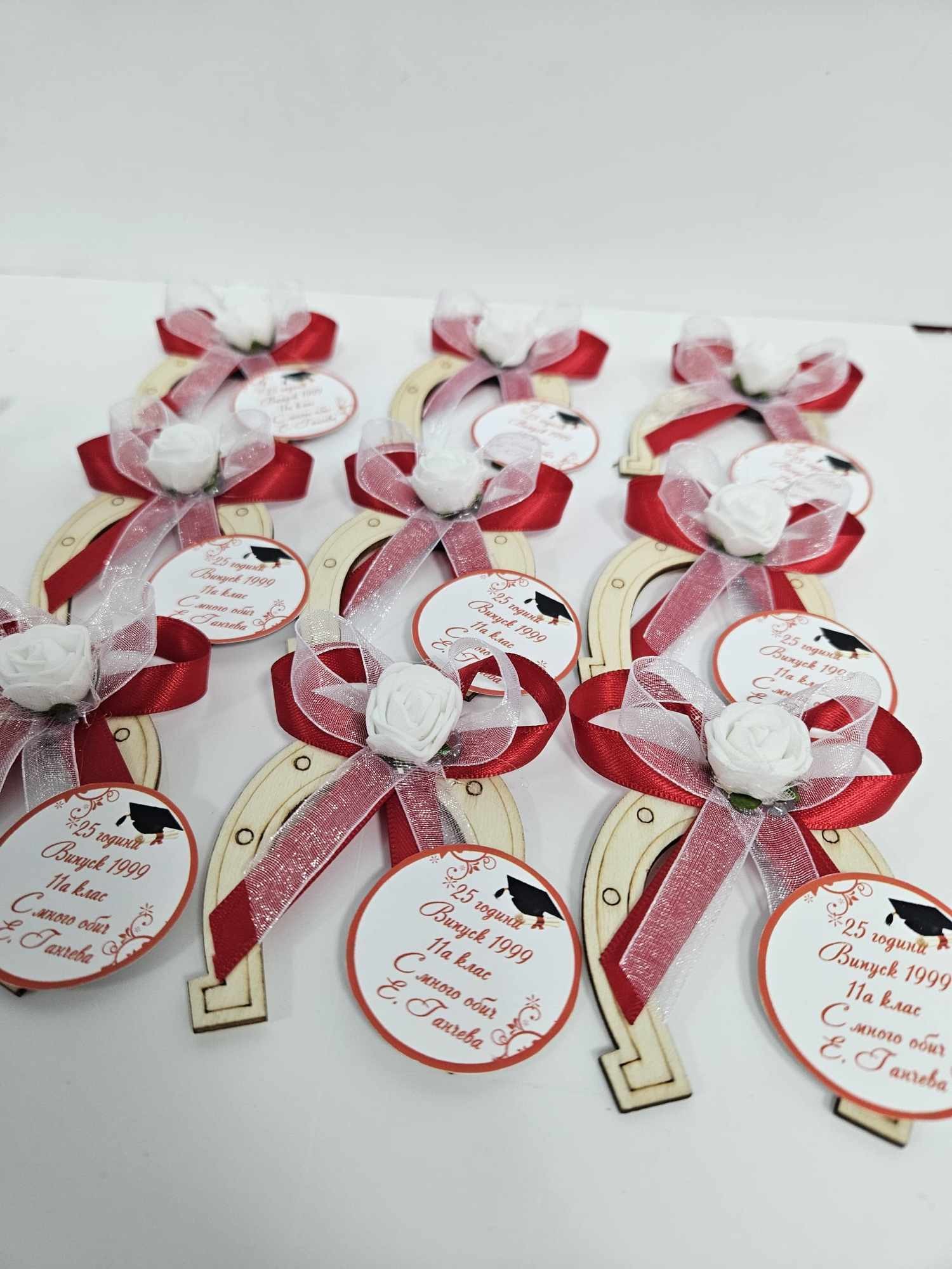 Дървена подкова – магнит, декорирана с рози, тичинка и органзена панделка, върху картонче могат да бъдат изписани имената и датата Ви или благодарствено послание.
