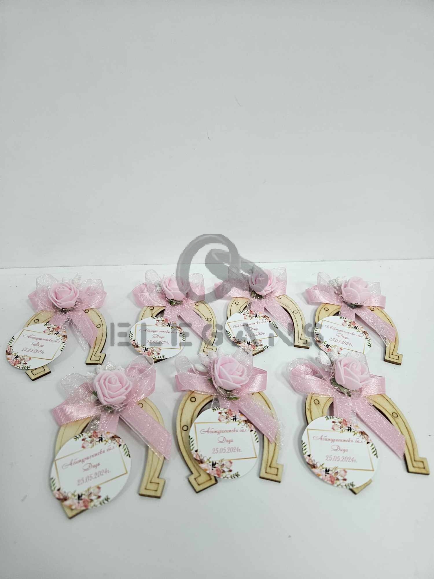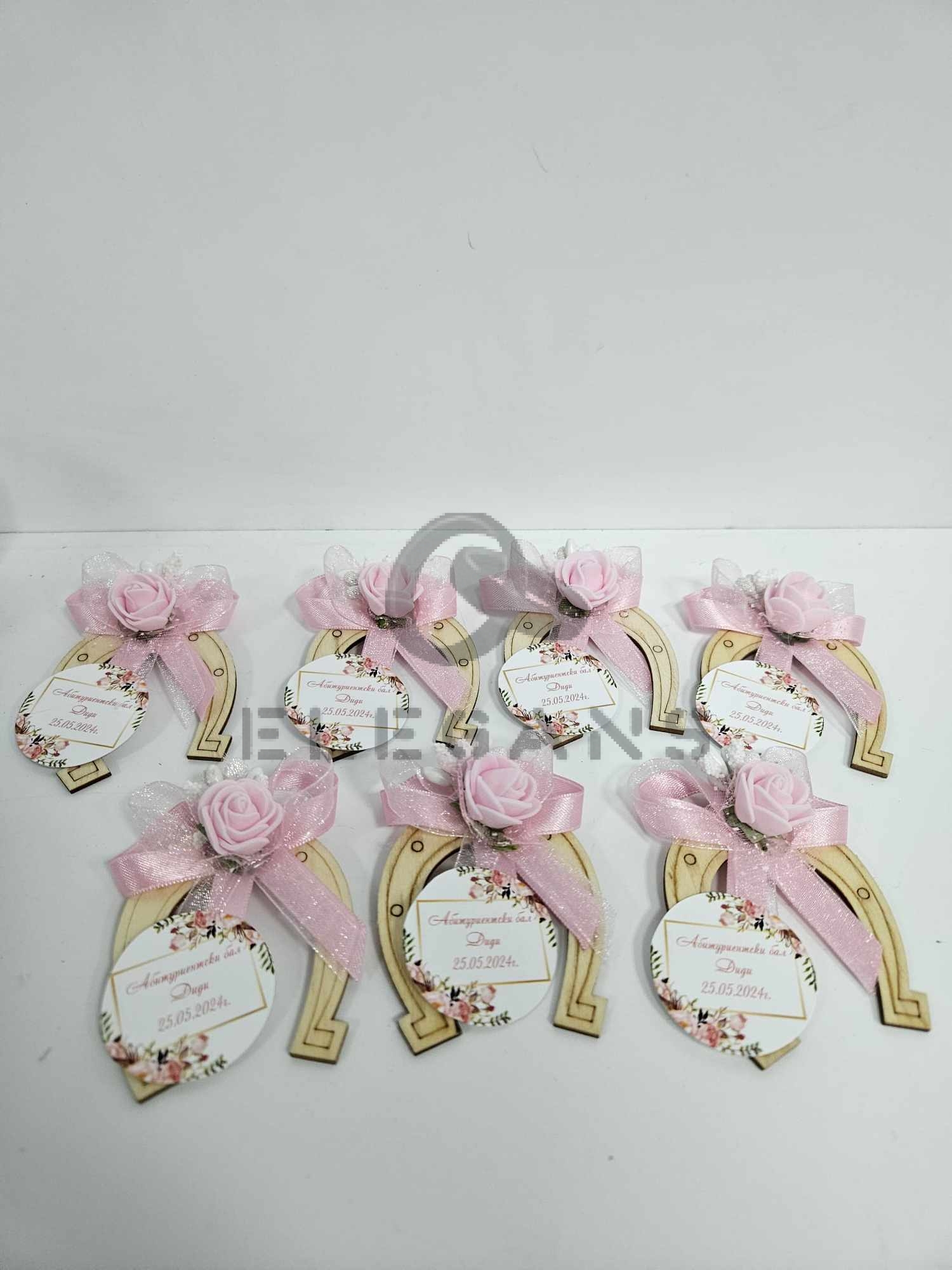 Дървена подкова – магнит, декорирана с рози, тичинка и органзена панделка, върху картонче могат да бъдат изписани имената и датата Ви или благодарствено послание.