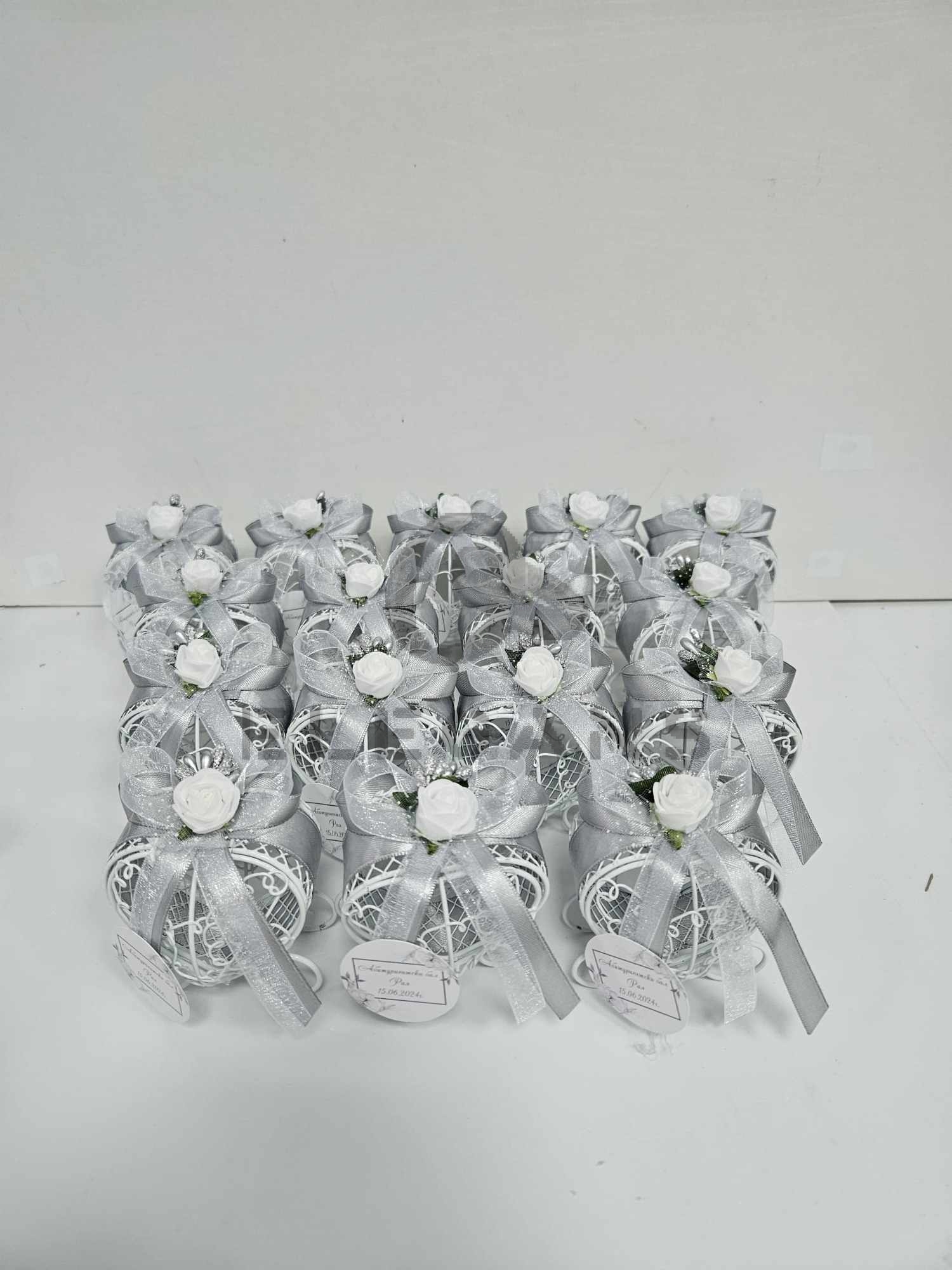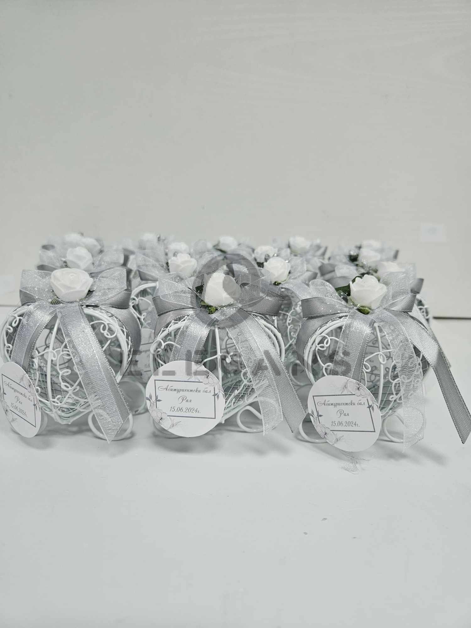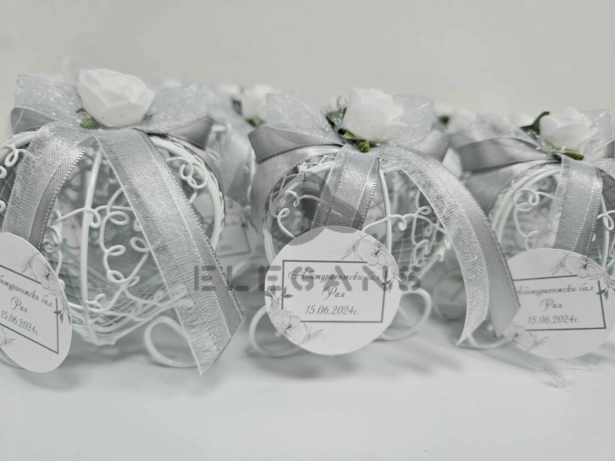 Метална каляска, декорирана със сатенена и органзена панделка, тичинки и рози. В картонено кръгче е изписан текст по избор.