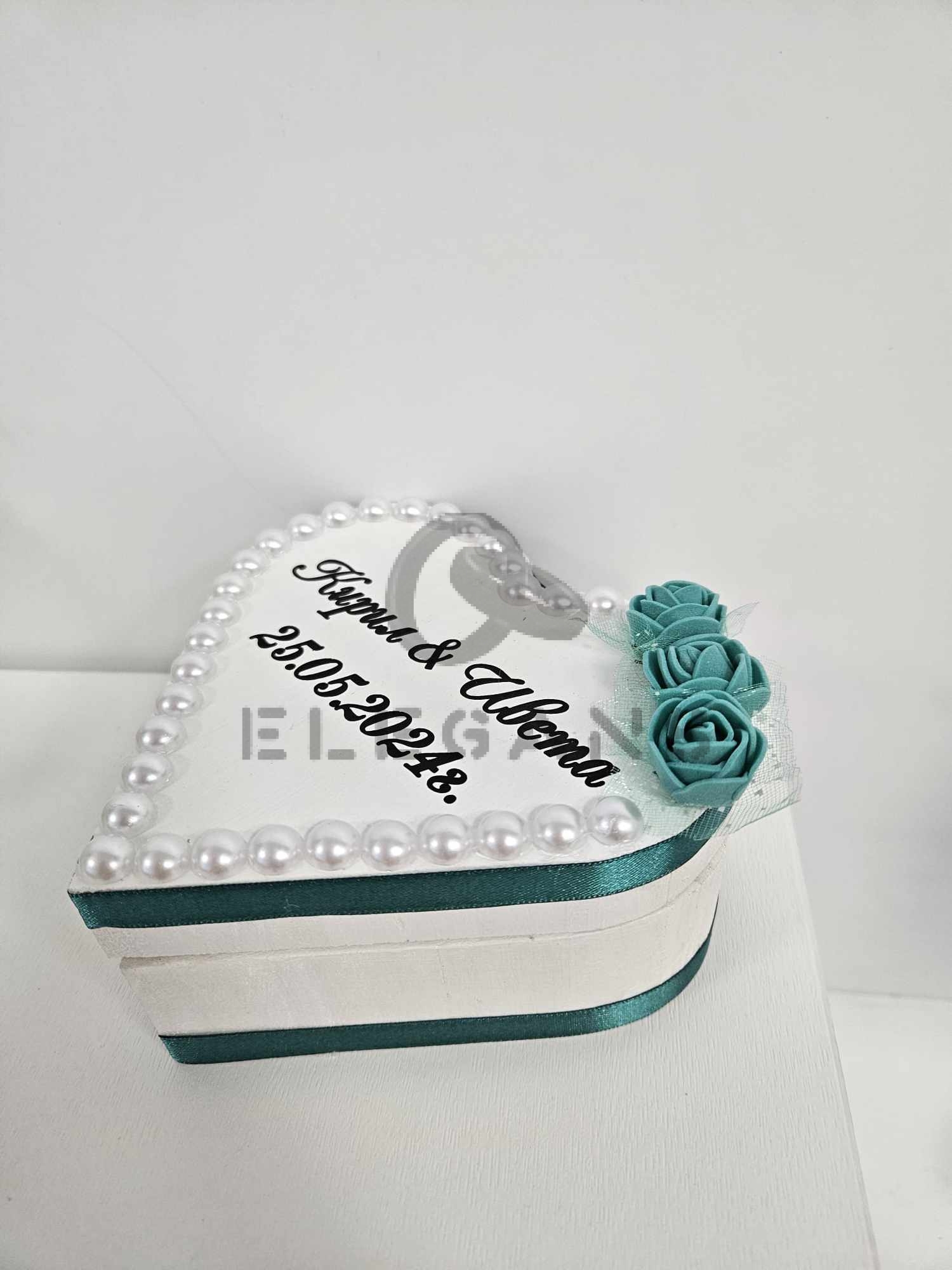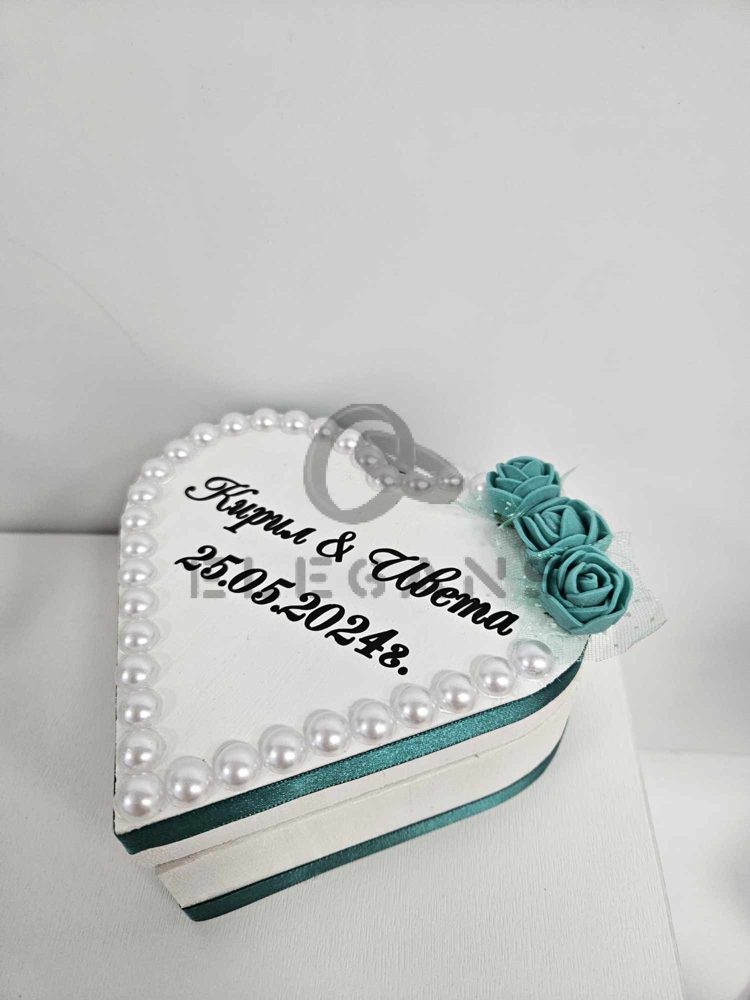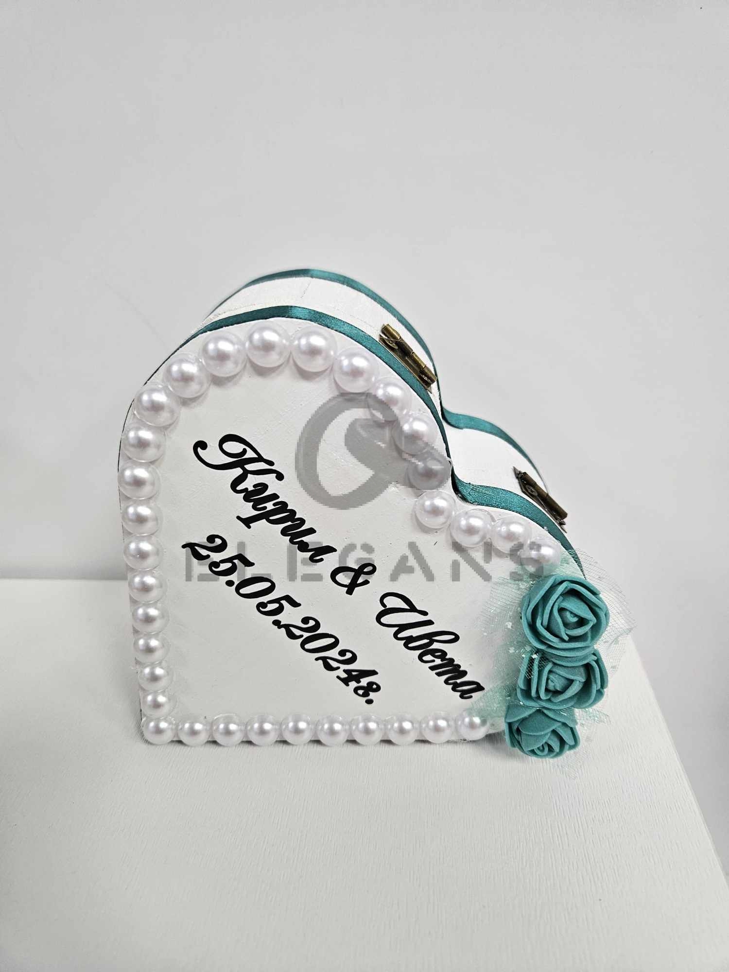 Бяла кутийка за брачни халки – сърце, ръчно изработена със сатенени панделки, рози и перли. Отвън на кутийката са изписани имената и датата на събитието, а отвътре – Вашите инициали.