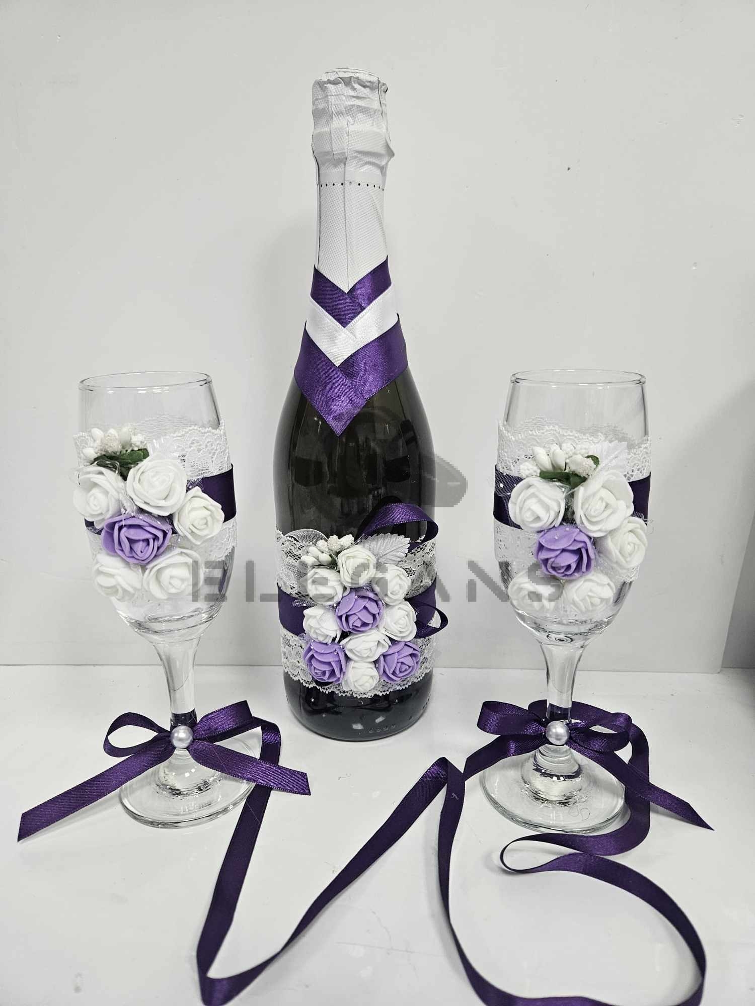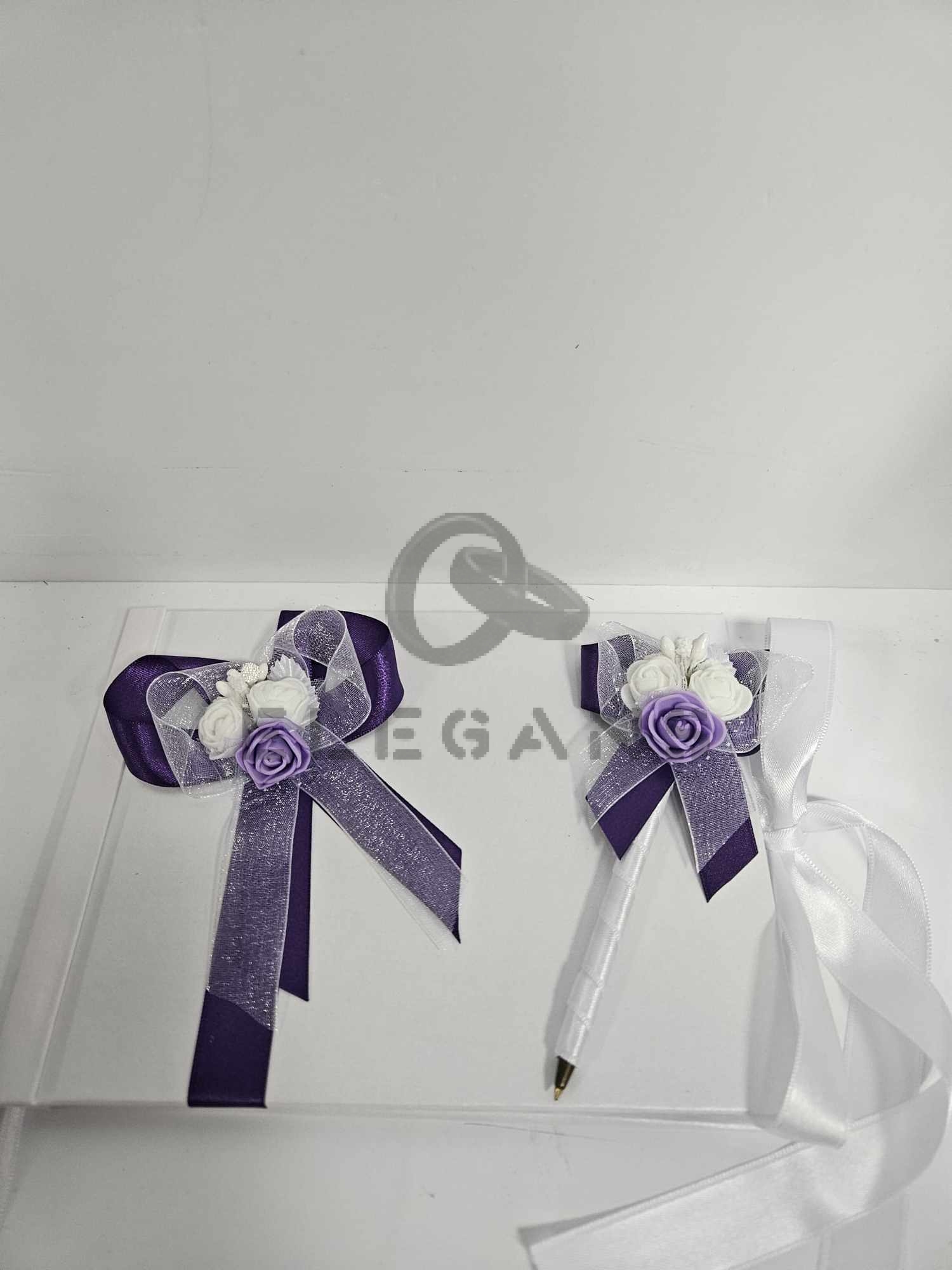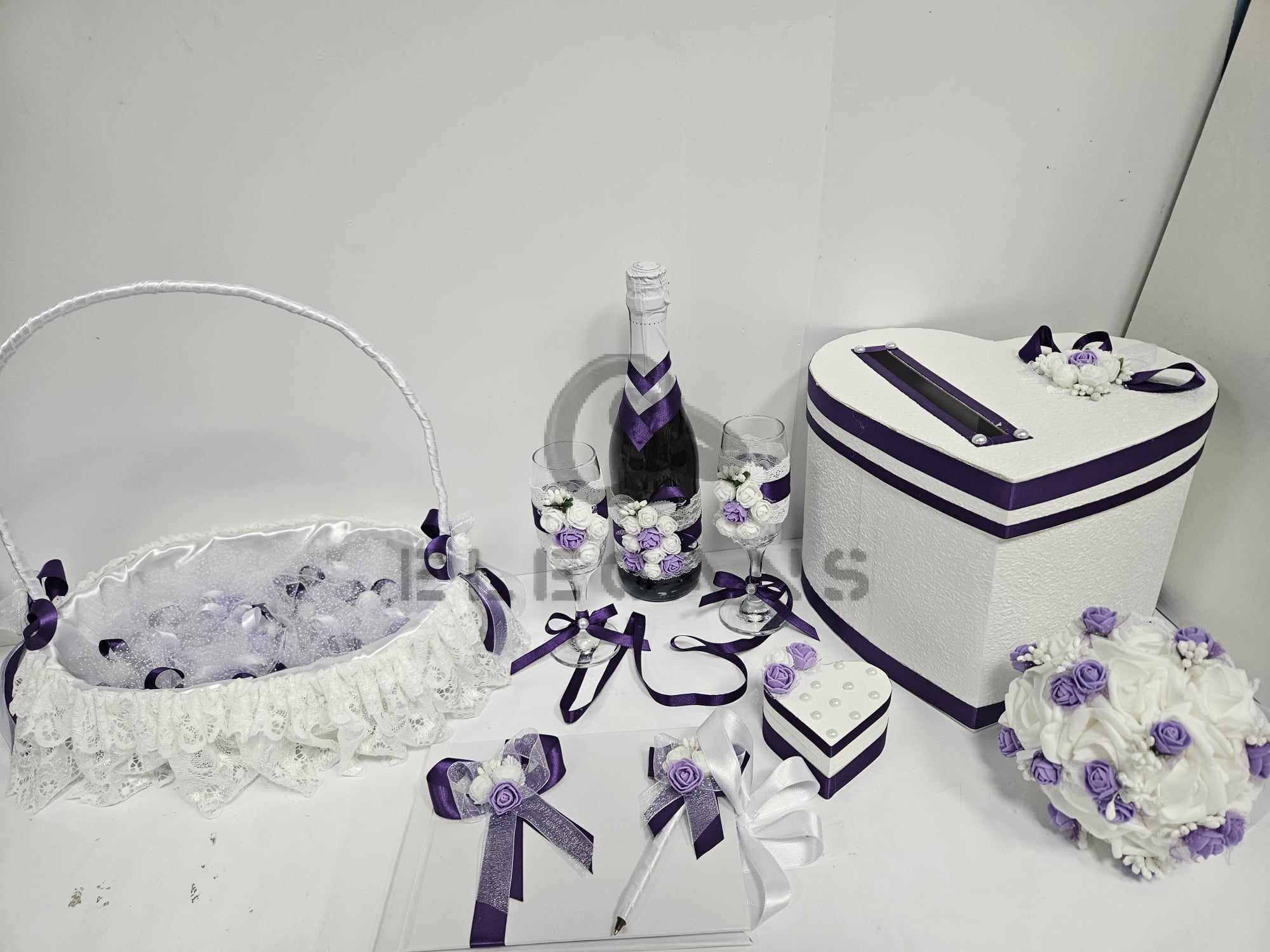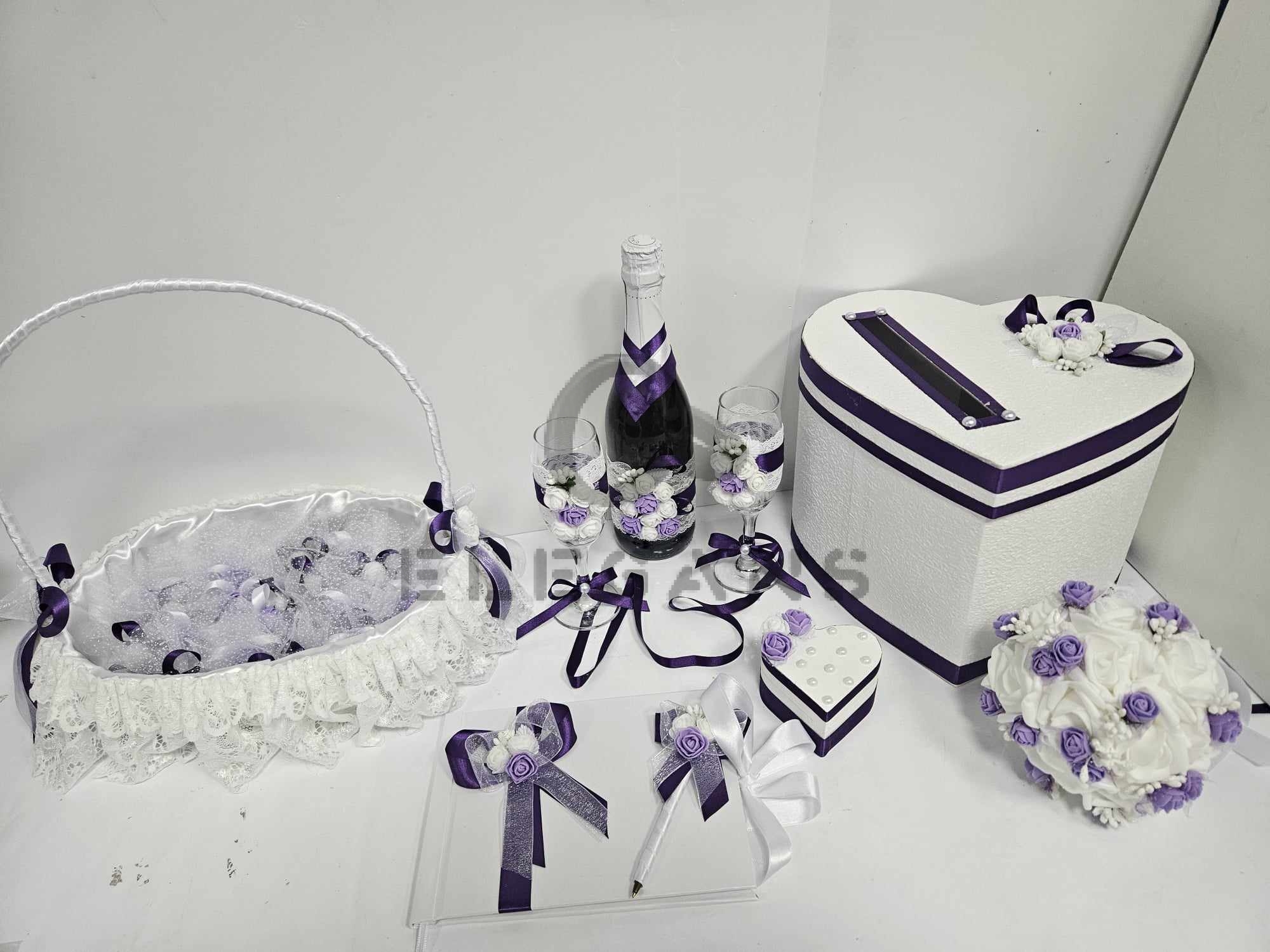 Сватбен комплект в бяло и тъмно лилаво, включващ: