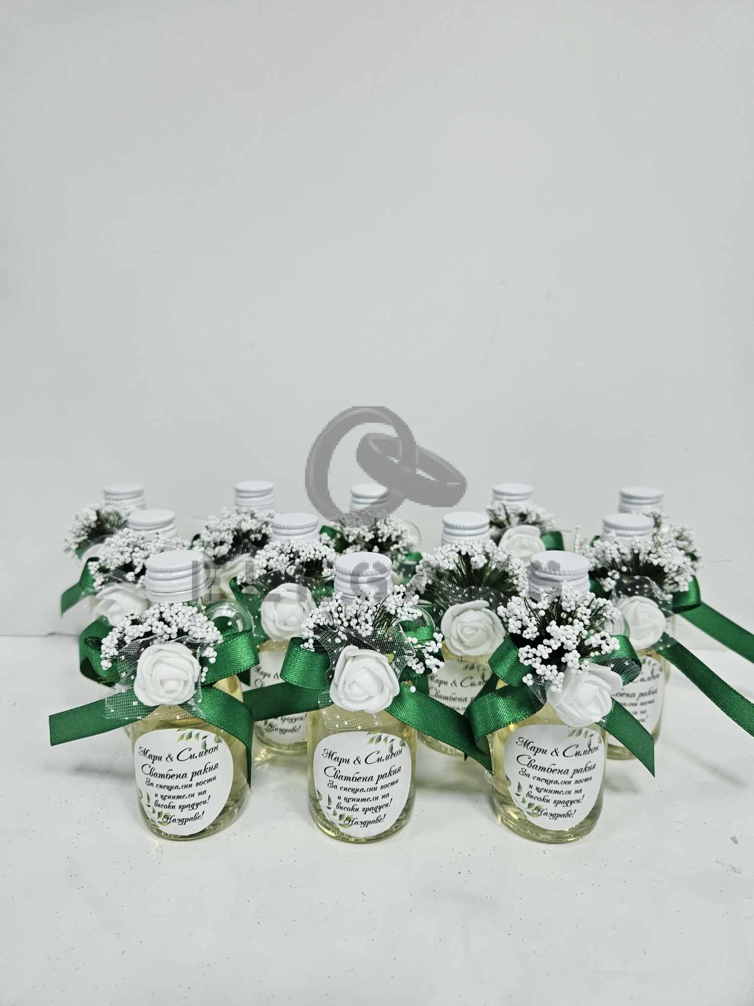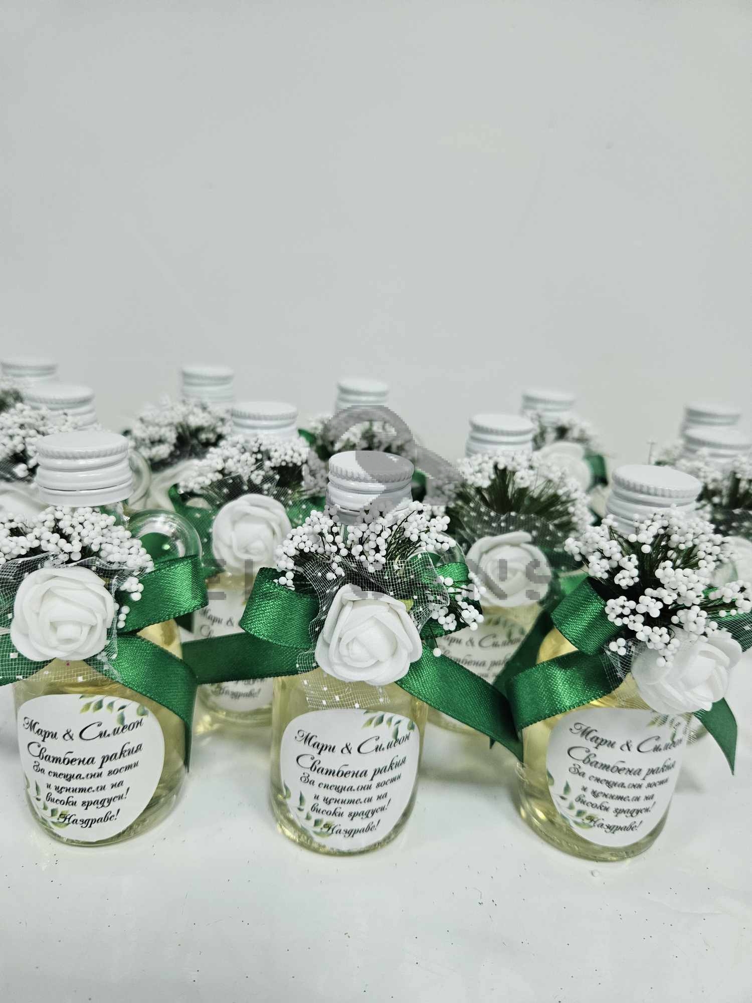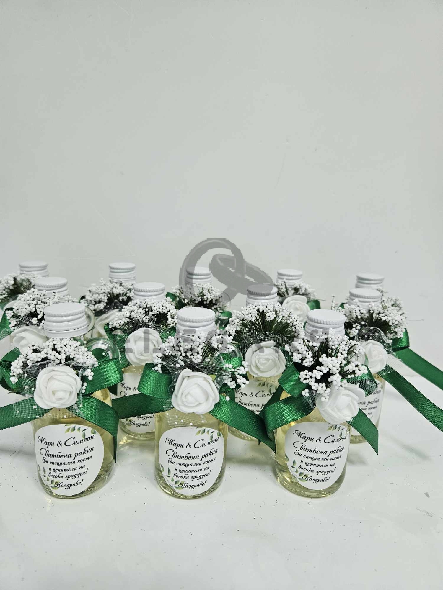 Шишенце с ракия, декорирано със сатенена панделка, тичинка и роза. Етикетче с надпис.