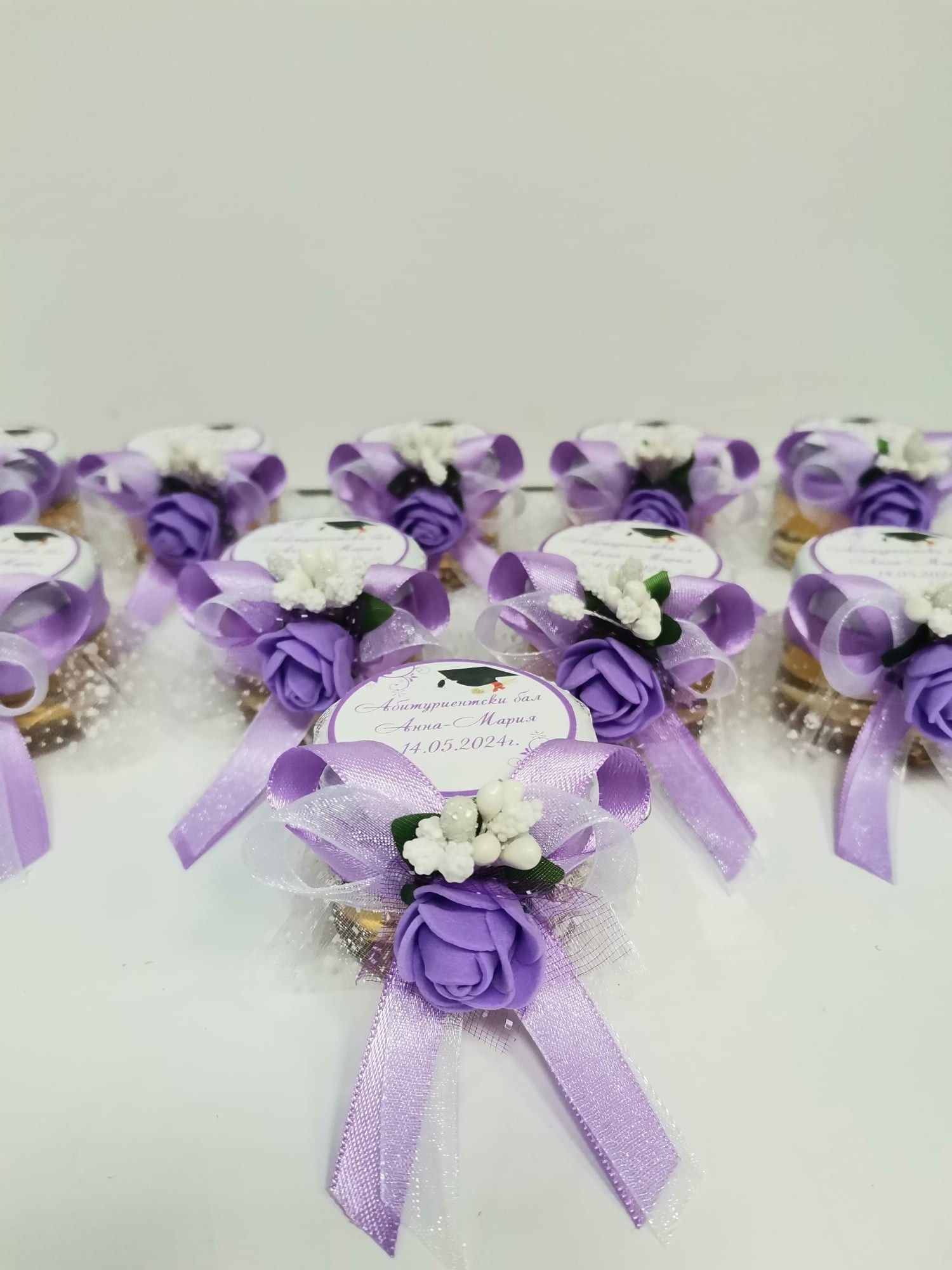 Бурканче с мед, декорирани с нежен тюл, сатенена панделка и роза. Върху картонче е изписан текст по Ваш избор.