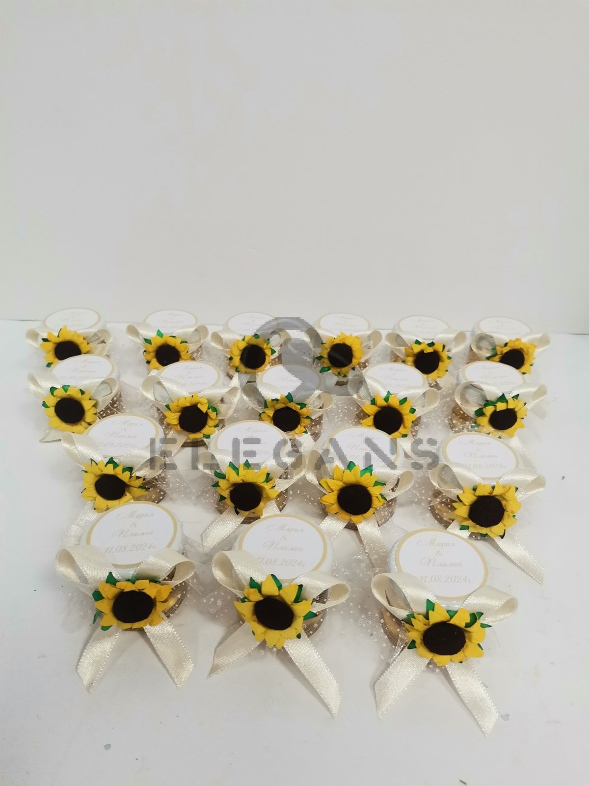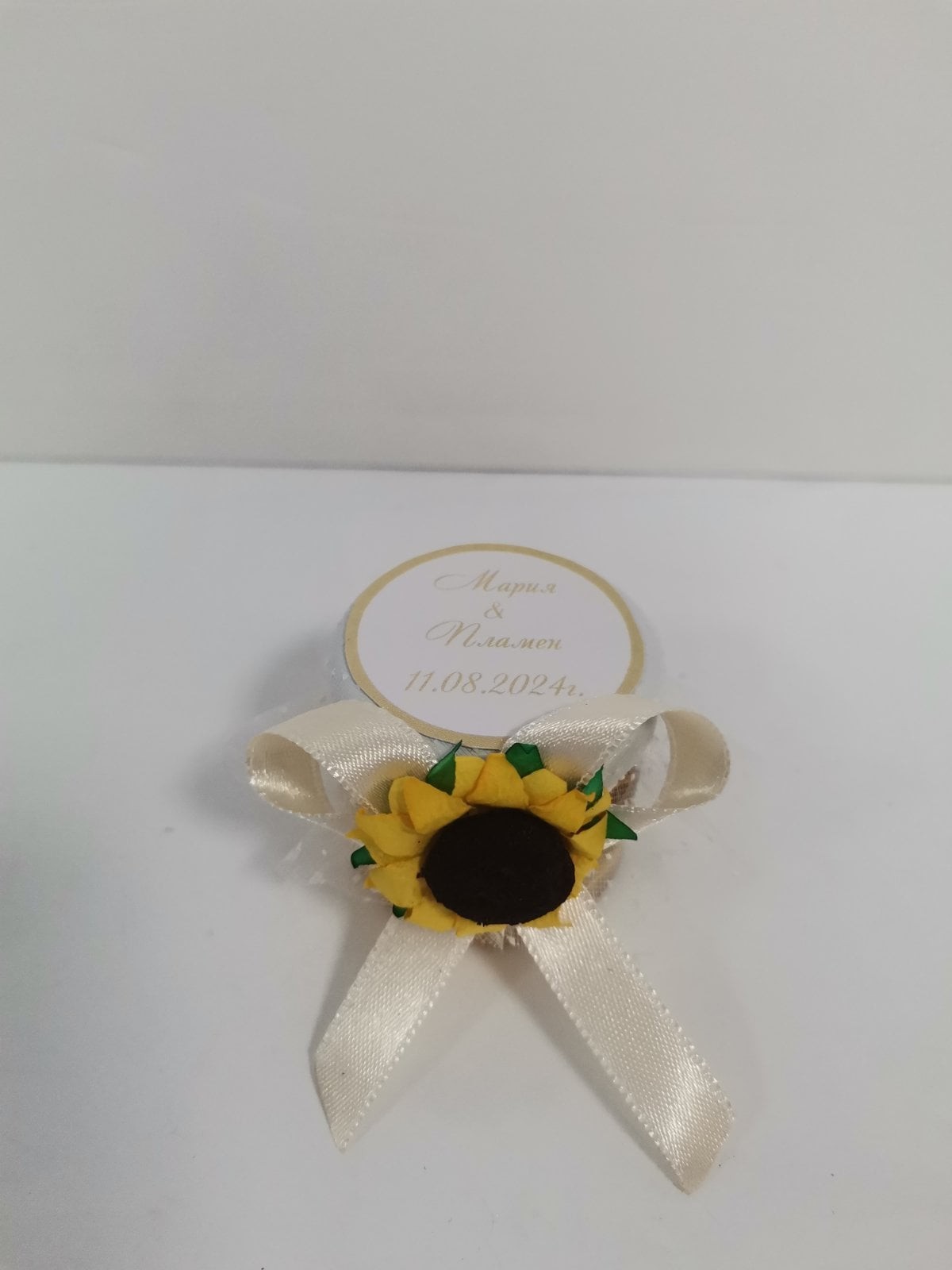 Бурканче с мед, декорирани с нежен тюл, крем сатенена панделка и слънчоглед. Върху капачето са изписани имената на младоженците и датата на сватбата.