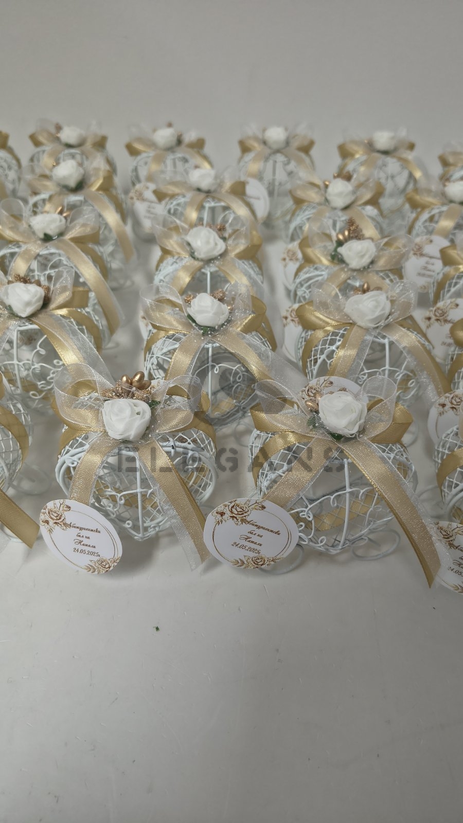 Метална каляска, декорирана със сатенена и органзена панделка, тичинки и рози. В картонено кръгче е изписан текст по избор.