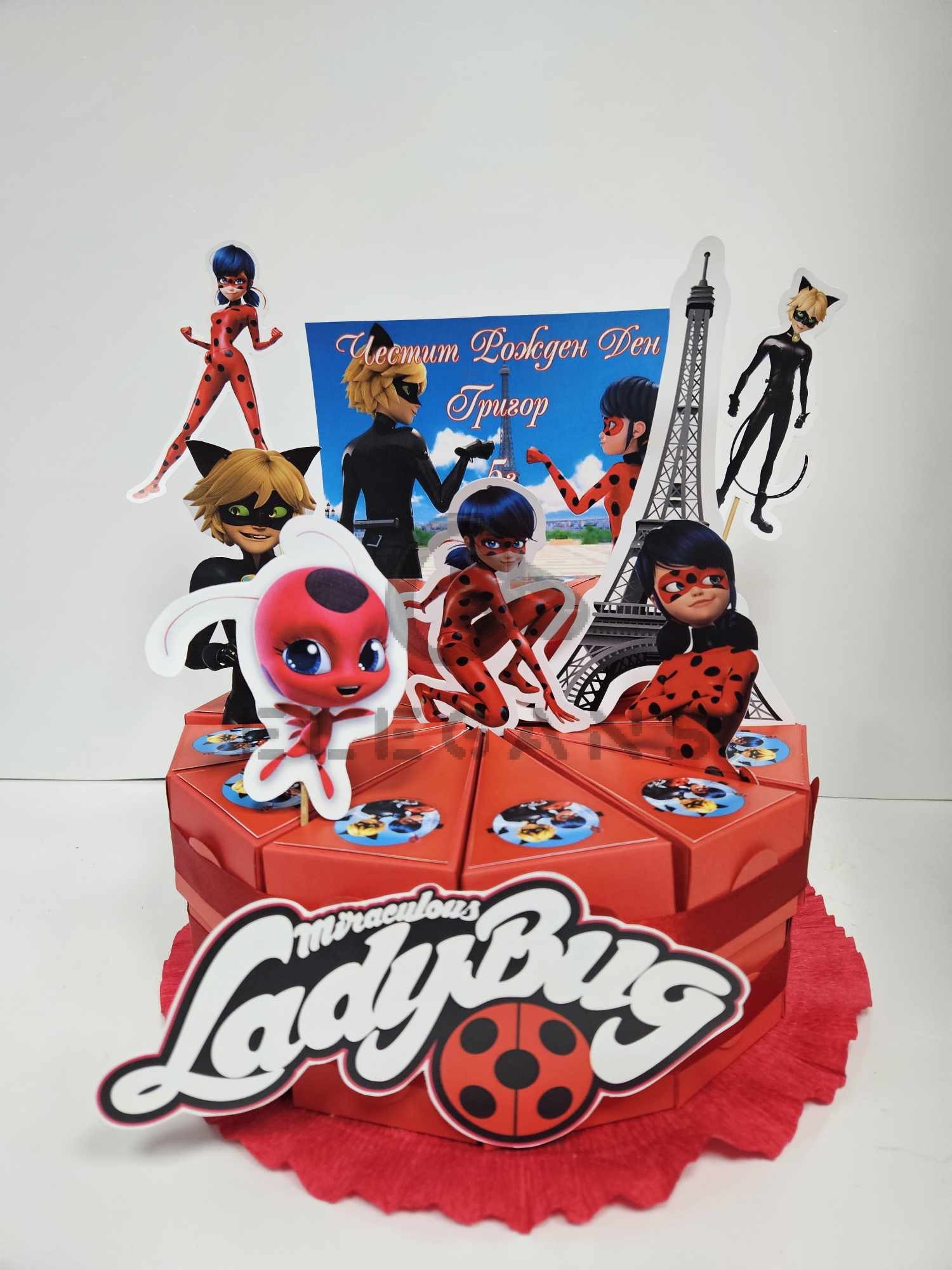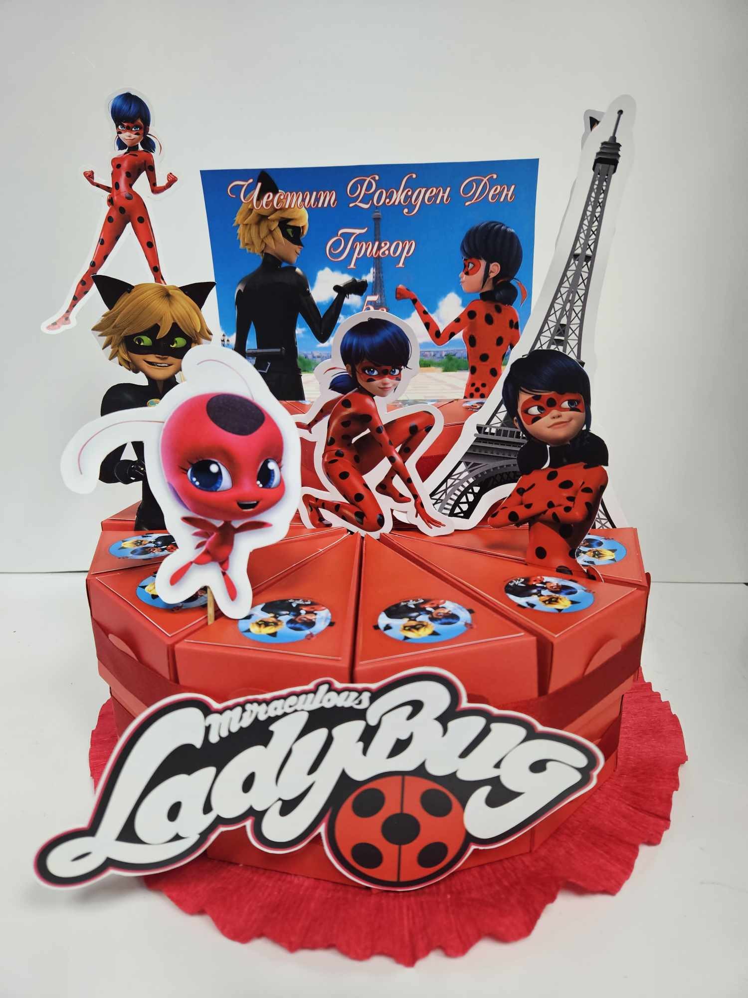 Картонена торта с лакомства за празника на Вашето детенце на тема Калинката и Котарака.