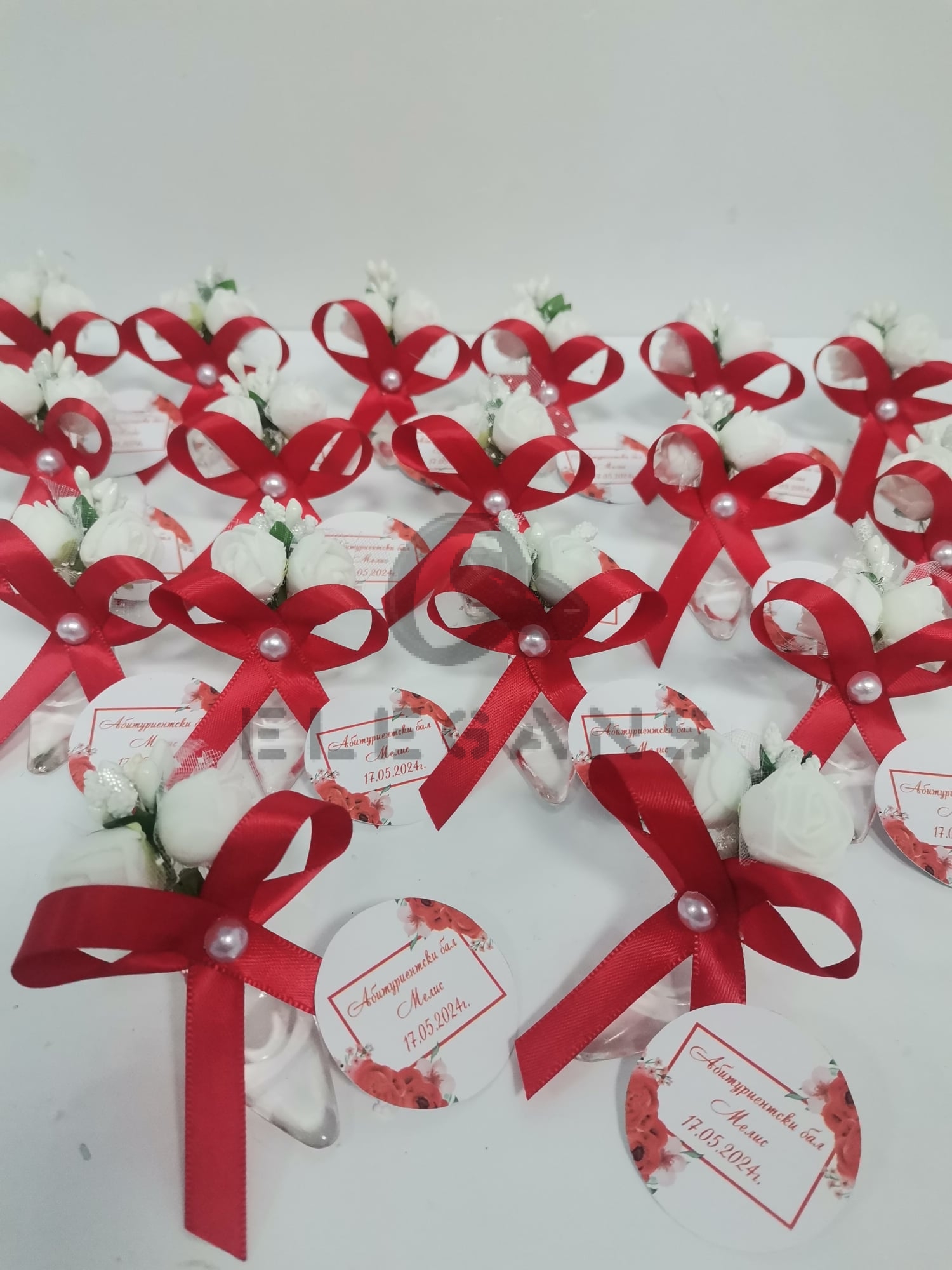 Обувка, декорирана със сатенена панделка, рози, тичинка и перла. Име и датата са изписани върху картонче.