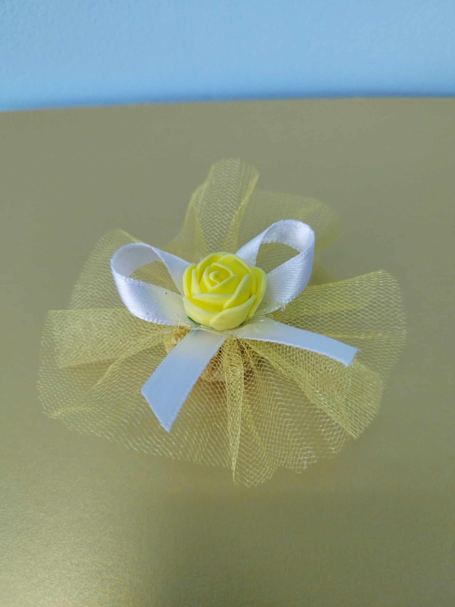 Сватбени късмети за хвърляне с цветен тюл, сатенена панделка и роза.