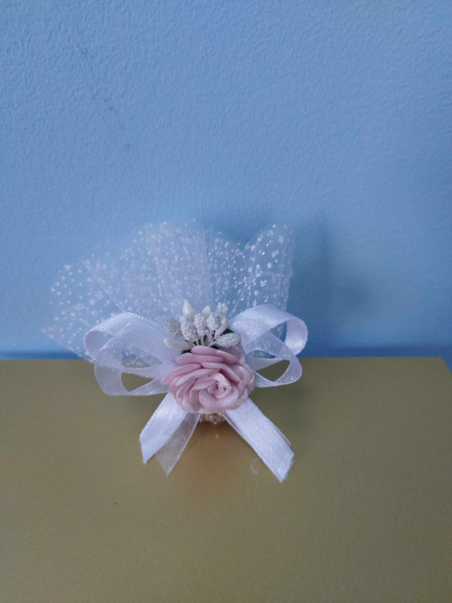 Сватбени късмети за хвърляне с бял брокатен тюл, сатенена панделка, тичинка и роза.
